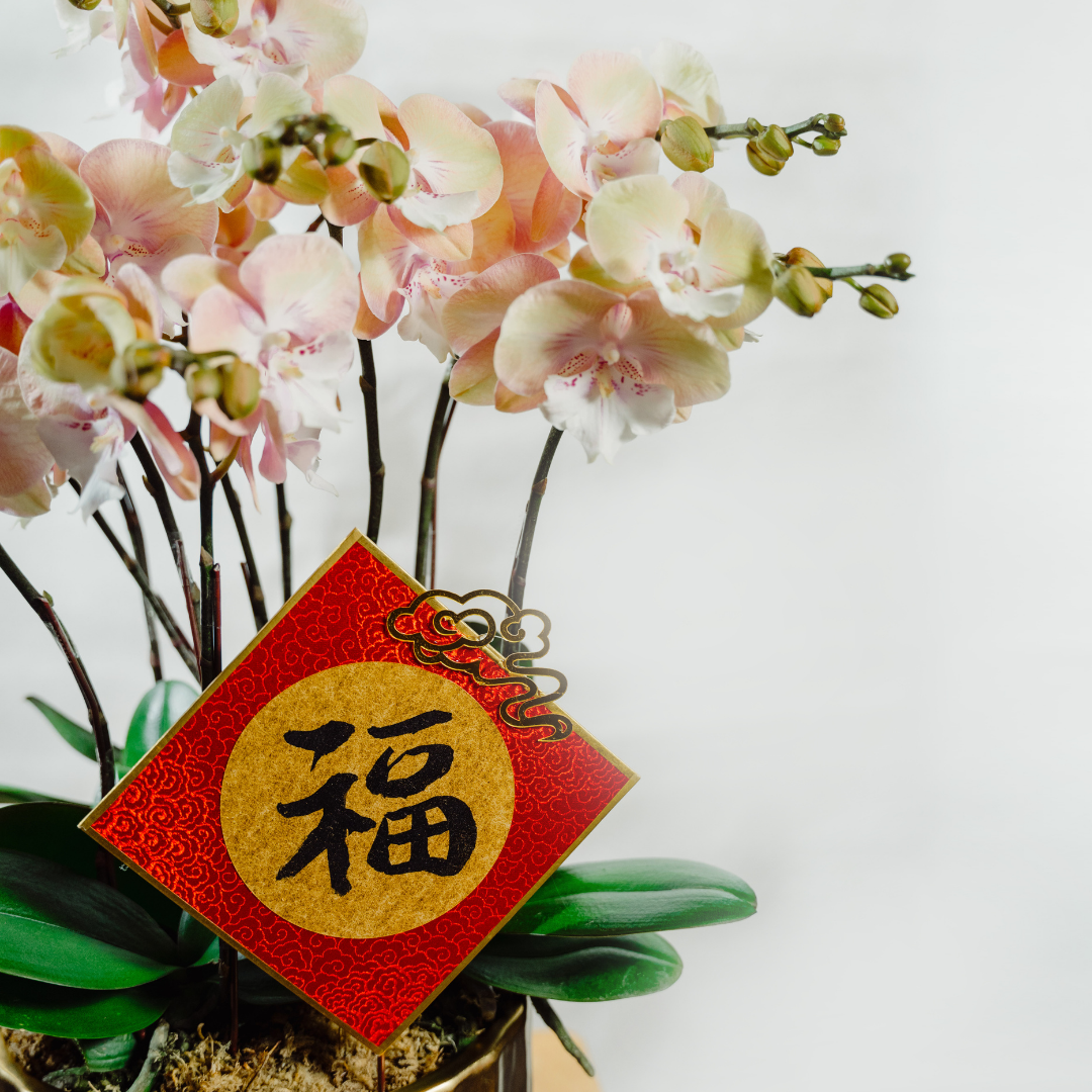 除了奪目外觀,此雅緻設計更蘊含深厚的農曆新年祝福。柔和的粉肉色調,寓意溫情、愛意與涓涓福澤;而數字「五」則象徵平衡、和諧與「五福」臨門。蝴蝶蘭自古是君子之德與高雅品味的標誌,預示著春日高潔的到來。